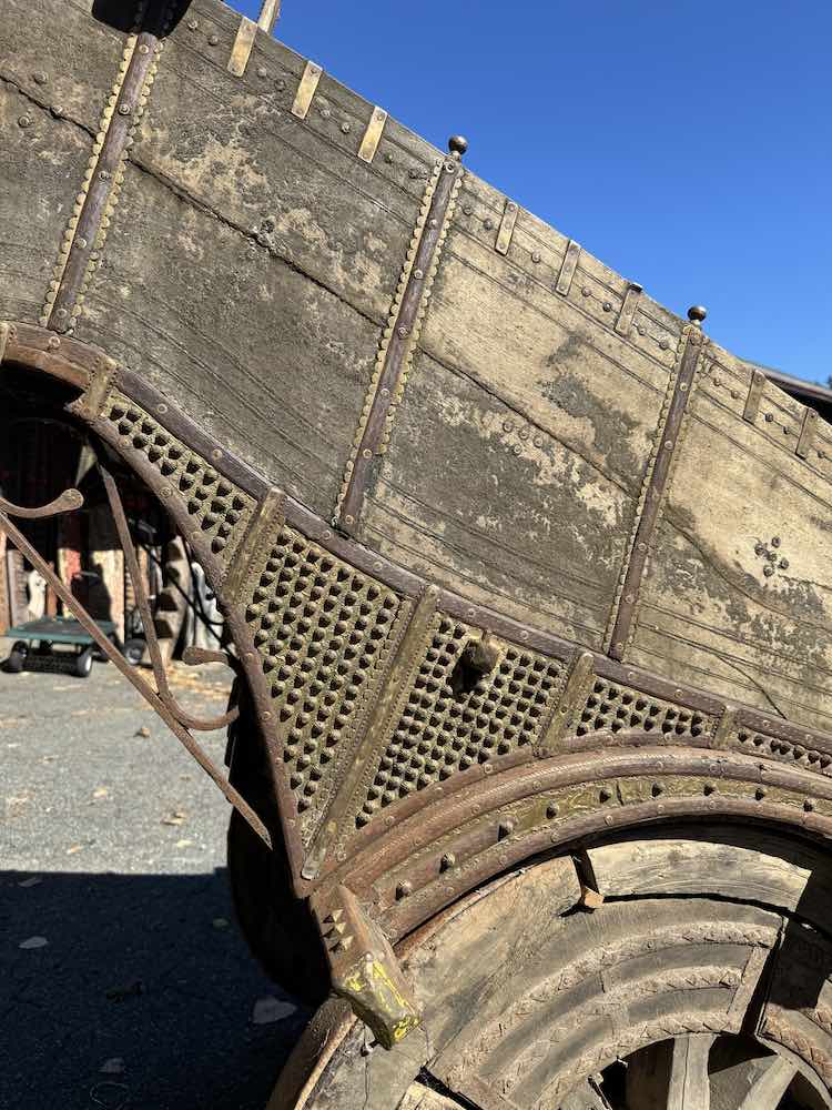 An outstandingly beautiful decorated camel pulled cart. Which symbolizing a traditional mode of transportation that is still in use in some areas of Asia. Original Iron and brass pieces decorated all over the cart.The wheels are heavily covered in iron and decorated with brass as well. A unique piece that is rarely seen these days inside or outside of India. While most camel carts are for transferring goods and farm produce, this one was used for taking an aristocratic family while traveling.