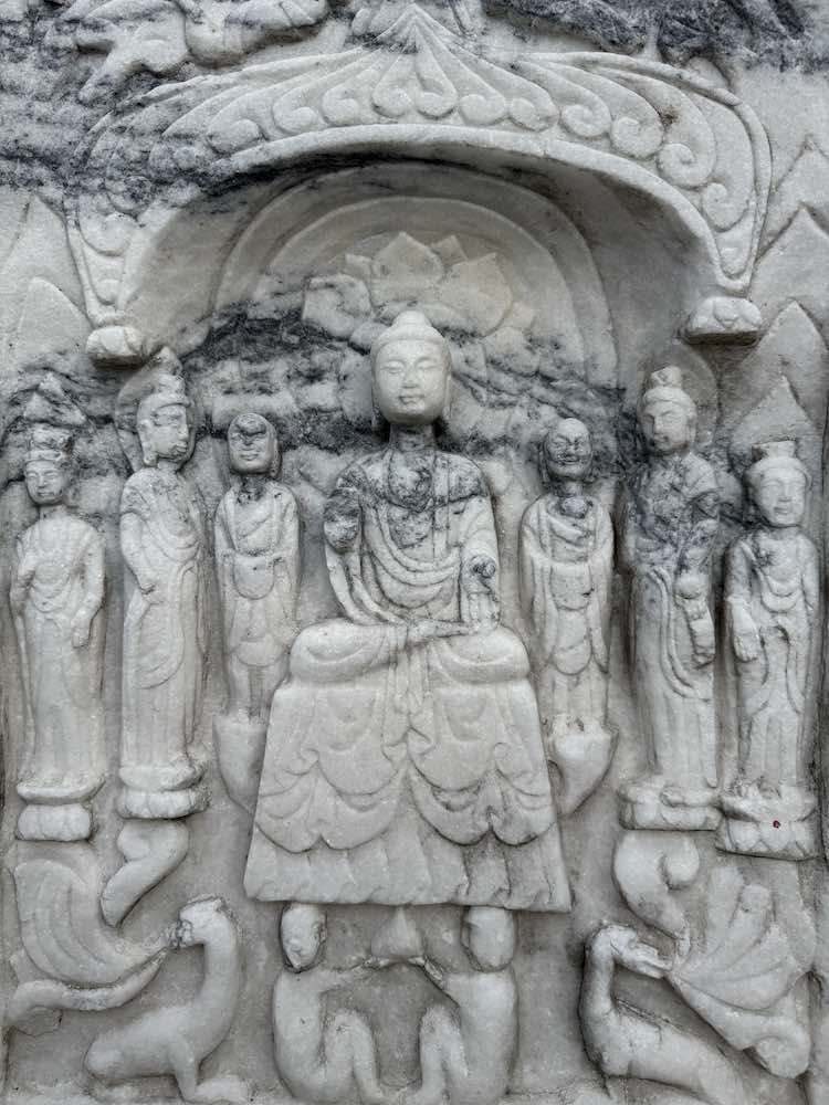 An antique white marble Bodhisattva stella from old temple in China. Originally used as part of the temple wall. Each piece would be carved with stories about different stage of Buddha’s life. This piece in particular is about Buddha’s teaching the followers to not afraid to face their difficulties, situation, even death after his enlightenment.