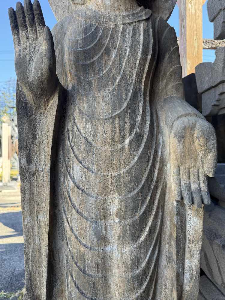 Old Chinese temple marble Buddha Standing Sculpture in Abhaya Mudra. Abhaya Mudra is a hand gesture of reassurance and protection that dispels fear. It is performed with one hand raised, palm facing outward, and fingers pointing upward, symbolizing divine protection, courage, and goodwill.